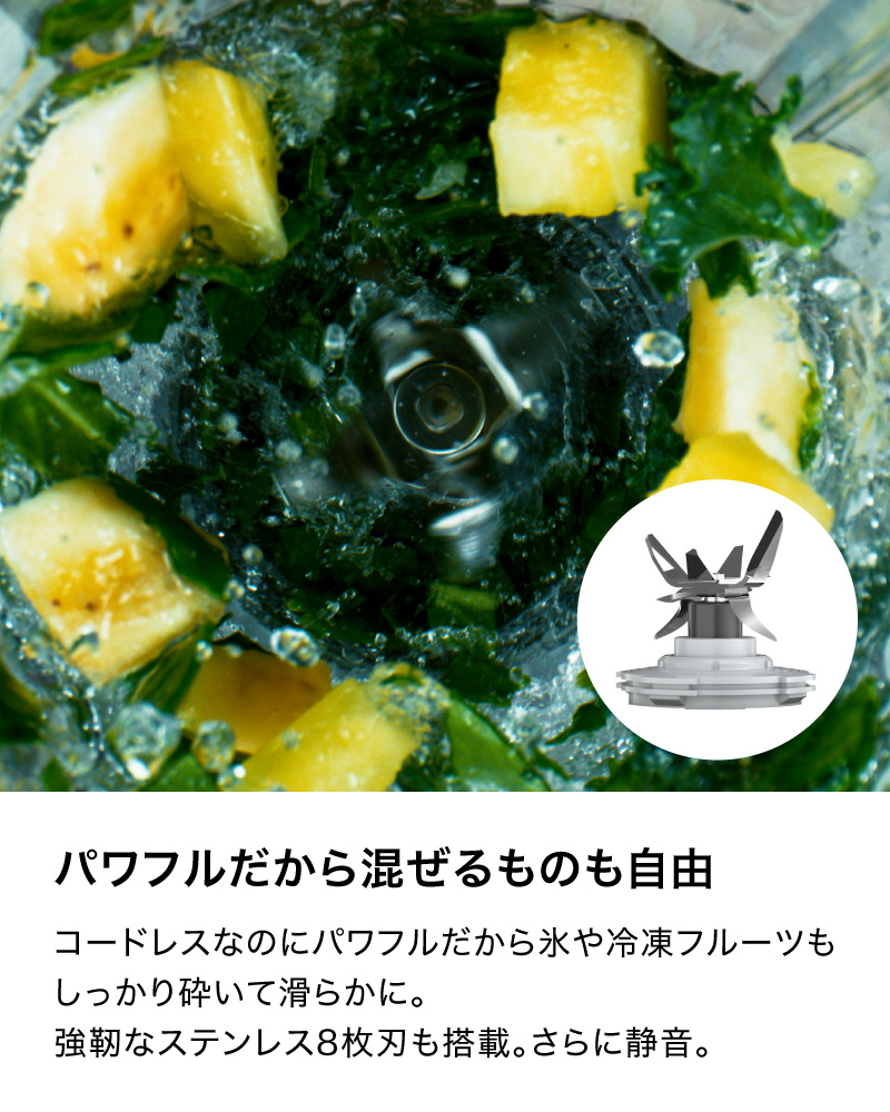 コードレスなのにパワフルだから角氷*1や冷凍フルーツもしっかり砕いてなめらかに。強靭なステンレス8枚刃を搭載