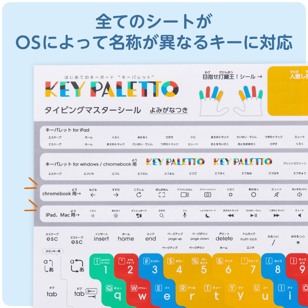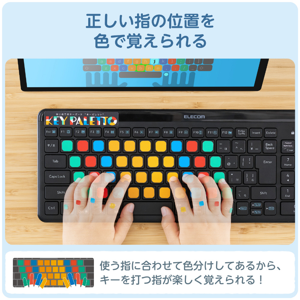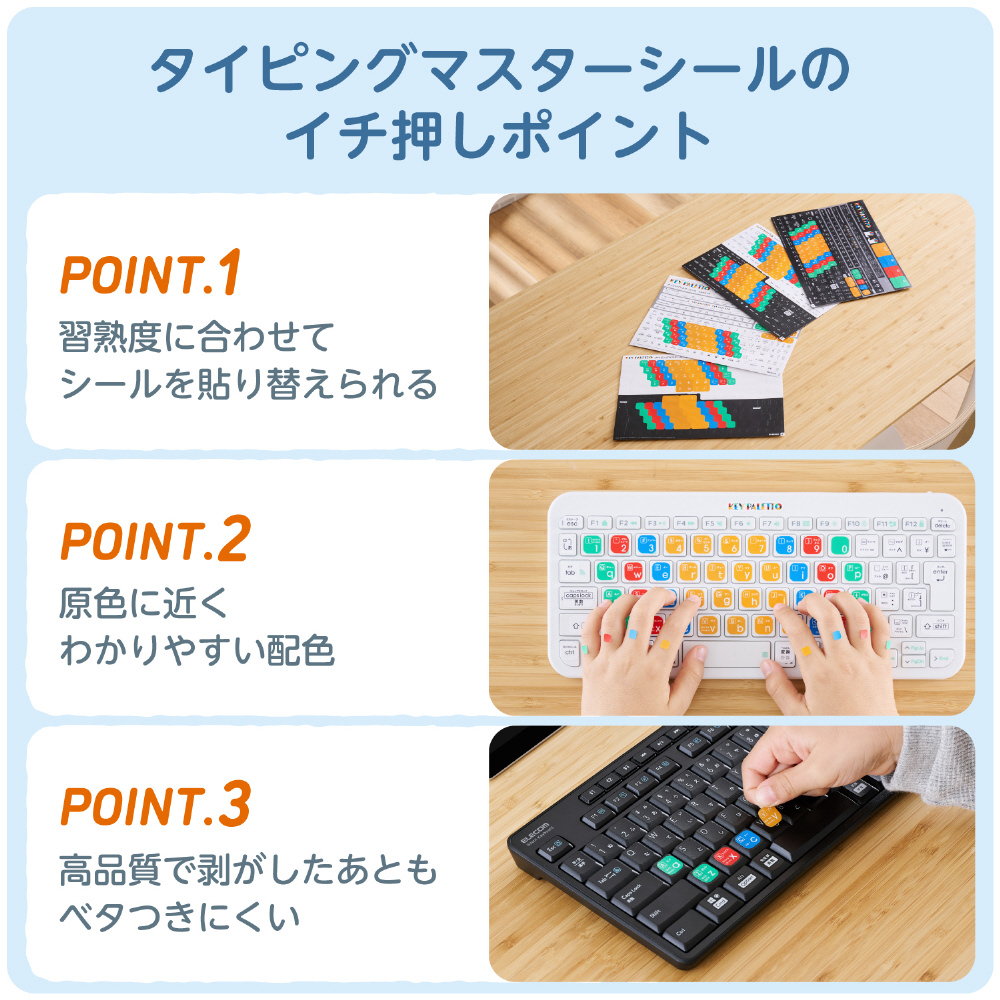 タイピングを楽しく学べる!キーボードに貼ってはがせるKEY PALETTO(キーパレット) タイピングマスターシールです。キーの読み方からタッチタイピングの習得まで完全サポート。習熟度に合わせて使い分けられる4種類のシールで、タイピングスキルをレベルアップできます。