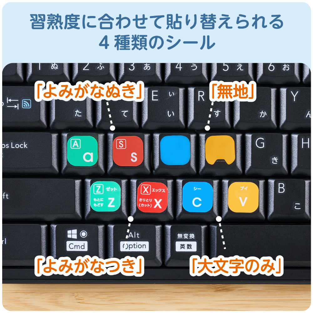 タイピングに慣れたら「よみがなぬき」のシールで、キーの位置や指運びに集中して覚えてみましょう。