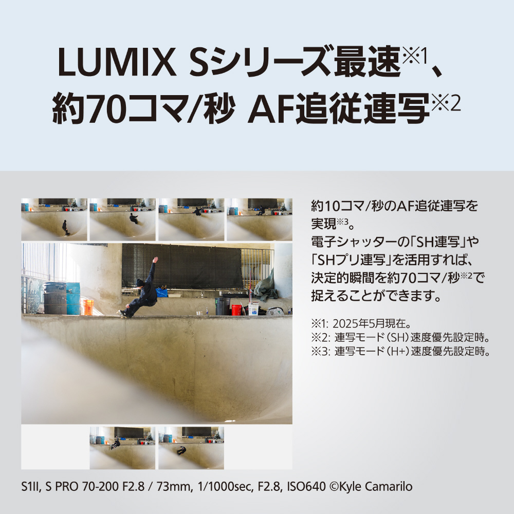 【メカシャッター】[H:高速]速度優先:10コマ/秒(AFS/MF時)、8コマ/秒(AFC時)(LV) 【電子シャッター】[SH:超高速]速度優先:70コマ/秒(AFS/AFC/MF)