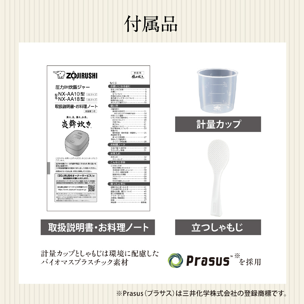 立つしゃもじ(Ag+抗菌加工)・白米用計量カップ(約180mL = 約1合)・取扱説明書(お料理ノート・保証書)
