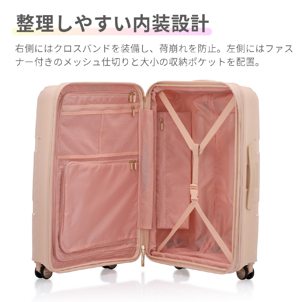 整理しやすい内装設計:右側にはクロスバンドを装備し、荷崩れを防止。左側にはファスナー付きのメッシュ仕切りと大小の収納ポケットを備え、衣類や小物をスマートに整理できます。
