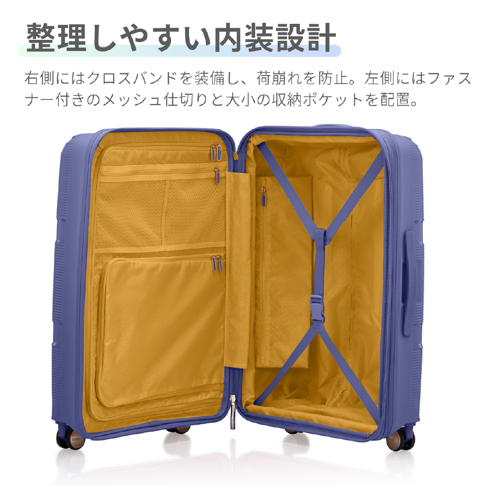 整理しやすい内装設計:右側にはクロスバンドを装備し、荷崩れを防止。左側にはファスナー付きのメッシュ仕切りと大小の収納ポケットを備え、衣類や小物をスマートに整理できます。