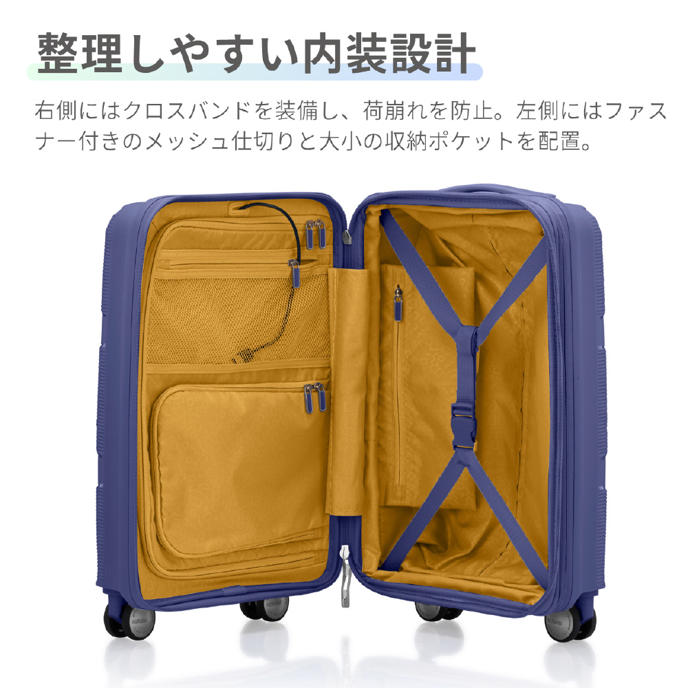 整理しやすい内装設計:右側にはクロスバンドを装備し、荷崩れを防止。左側にはファスナー付きのメッシュ仕切りと大小の収納ポケットを備え、衣類や小物をスマートに整理できます。