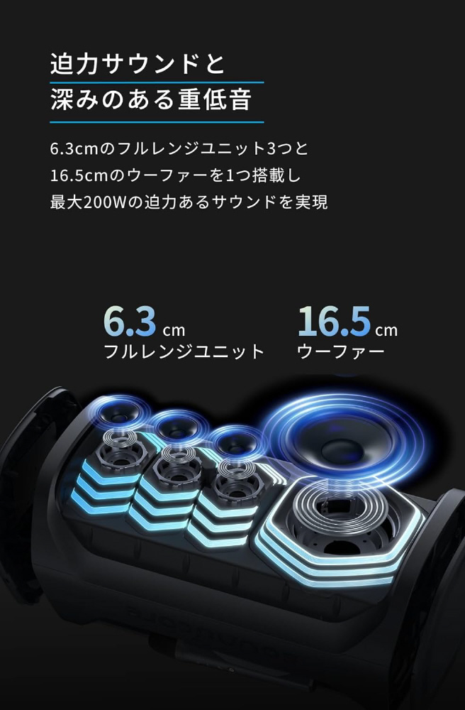 サイズ:約30.0 × 28.0 × 50.4cm、重さ:約10.2kg (マイク2本含む)、出力:最大200W、ドライバー:フルレンジ 6.3cm × 3 / ウーファー 16.5cm × 1、周波数帯域:40Hz-20kHz、防塵・防水規格:IPX4、AI機能:AIボーカルリムーバー、再生時間:最大12時間、対応コーデック:SBC / AAC