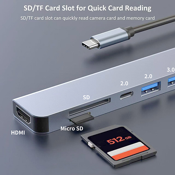 4K HDMI出力とType-C端子が2つ付いた少しスリムな7in1マルチハブです(HDMI/PDx1/USB2.0Cx1/USB3.0Ax1/USB2.0Ax1/SD/MicroSD)