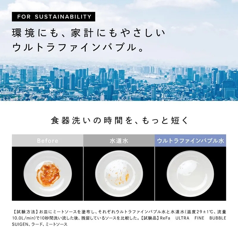 食器洗い:ウルトラファインバブルが汚れに吸着し剥がし取ることで、通常の水道水よりも短い時間で食器を洗えます。食器洗いに必要な水の節水にもつながります。ウルトラファインバブルが食器用洗剤の泡立ちを良くし、洗剤の使用料を少なくすることができます。