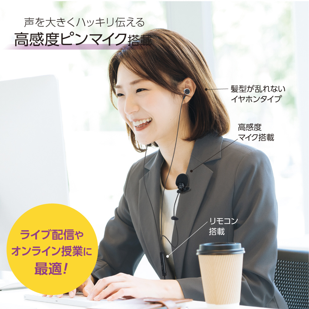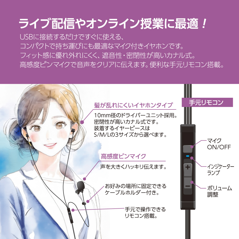 USBに接続するだけですぐに使える、コンパクトで持ち運びに最適なマイク付きイヤホンです。