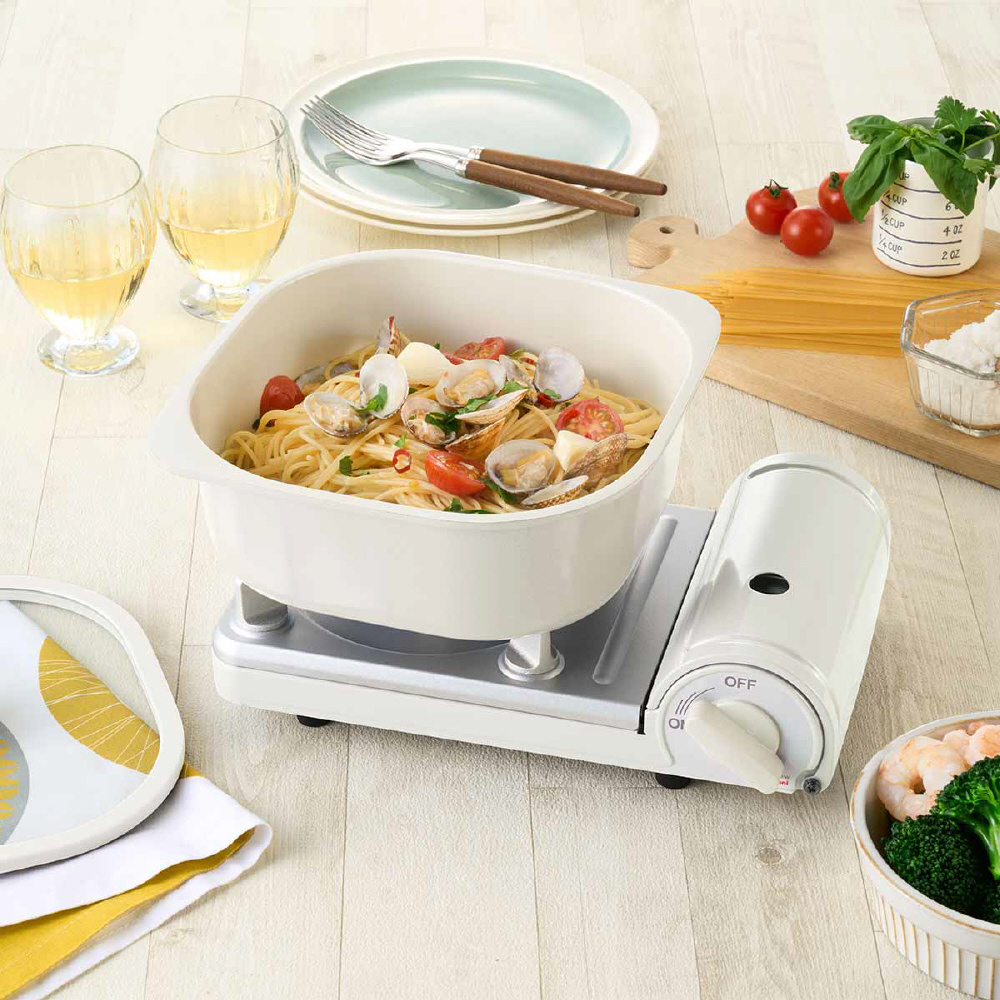インテリアになじむホワイト・モカと、食卓が明るくなるイエローの3色展開。セット使いで、毎日の調理、来客時、防災の備えとしても活躍します。