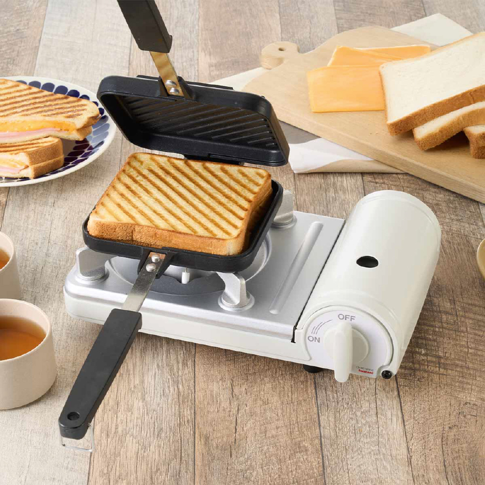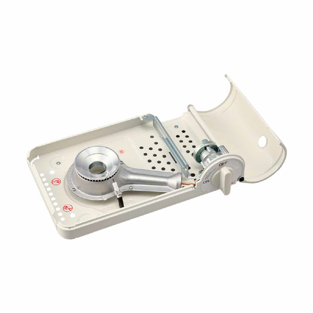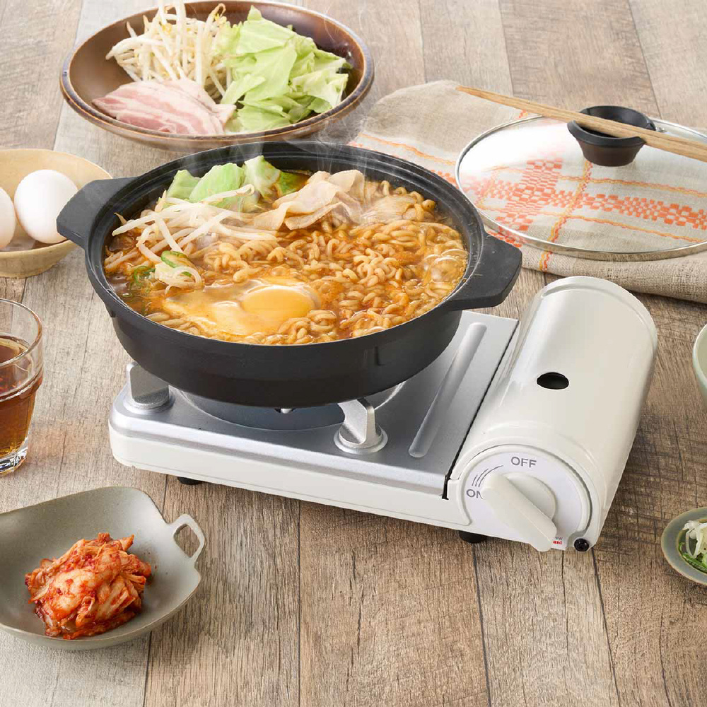 炎が外に広がりにくいタテ型炎口バーナーでムダ火を抑制。小型ながら鍋や焼肉など十分に調理が可能です。