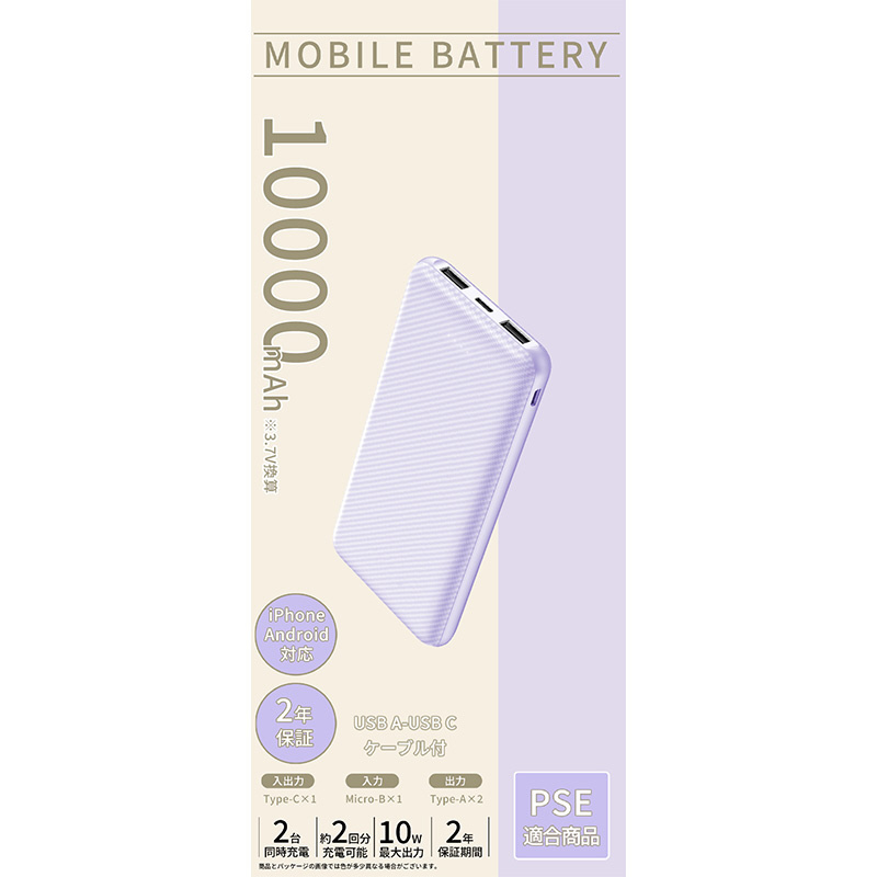 人気のASB-AS100シリーズの新色モデル おしゃれで明るいパステルパープル スマートフォン約2回充電可能 大容量×薄型で長時間の外出にぴったり。3ポート出力可能な10000mAhモバイルバッテリーです。 汚れにくく傷のつきにくいツヤのある表面加工、残量表示LEDライト等、細部までこだわり、使いやすさとデザイン性を両立しました。 ラウンド形状と薄型コンパクト設計でスマートフォンと重ね持ちしやすいデザインです。