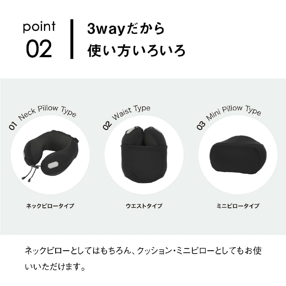 「3WAYネックピロー」は、旅行や日常の移動中に快適な休息を提供する、マルチユースなアイテムです。変幻自在に形を変えることで、どんなシーンでも大活躍します。