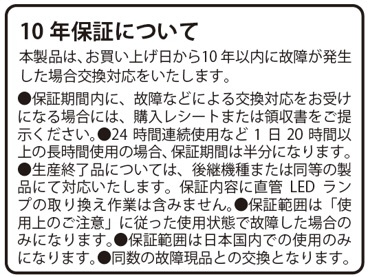 購入から10年間は点灯保証いたします。万が一の不点灯でも安心です。但し通常使用時に限ります。