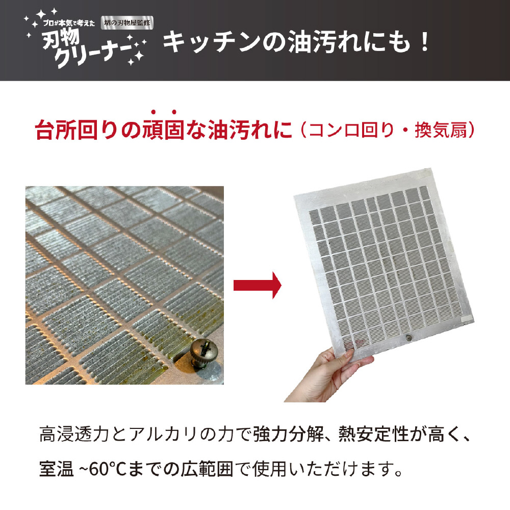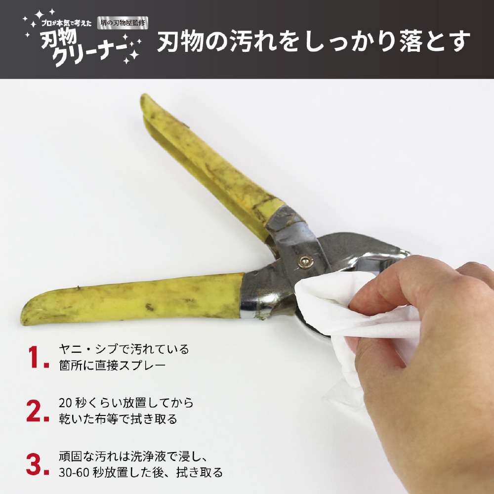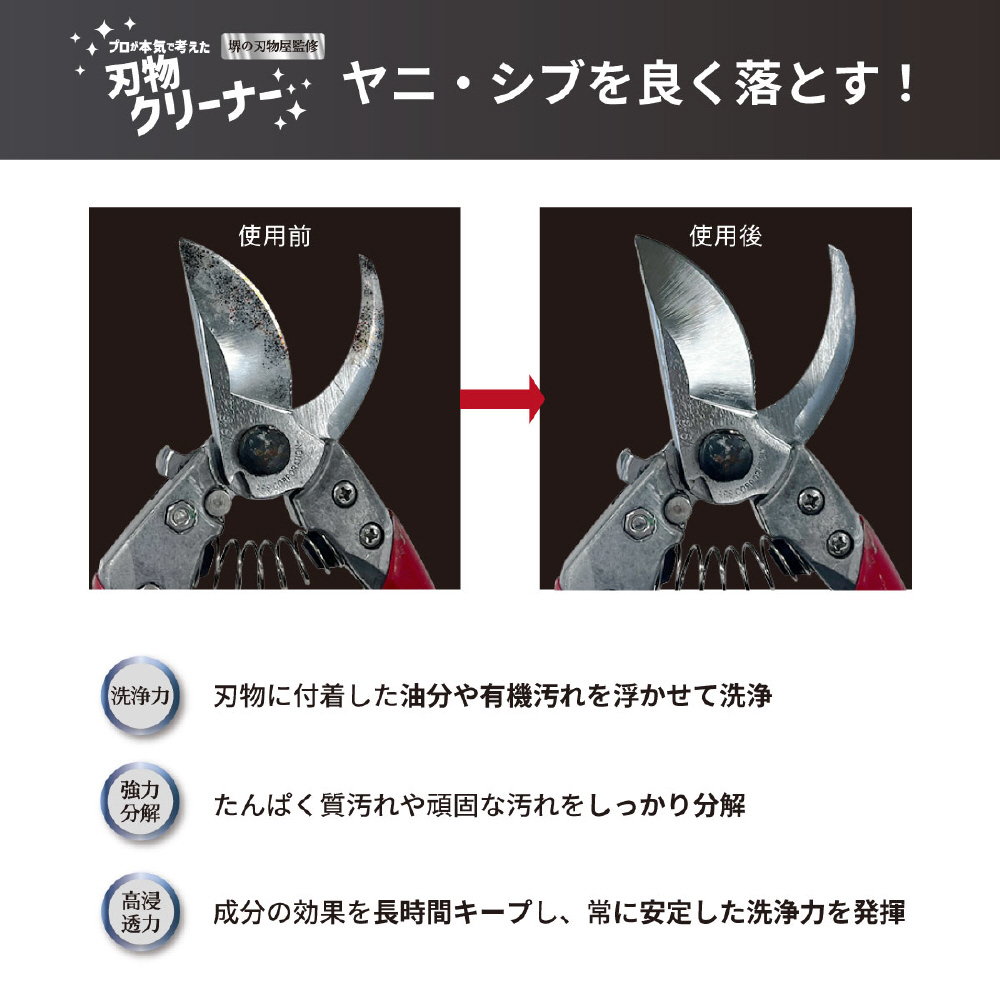 ●用途:刃物の汚れ、樹液(ヤニ・シブ)、換気扇・レンジ等油汚れ、機械汚れ。●高浸透力とアルカリの力で強力分解。●熱安定性が高く、室温から60℃で使用可能。●吹付け目安:2,3回、もしくは100ML/m2●方法:汚れた場所に洗浄液を吹き付ける。または、スポンジ等で浸し、60秒程度放置してから乾いた布で拭いてください。●容量:350ML●パッケージサイズ:W100×D95×H220(mm)●注意:用途以外に使用しない。子供や認知症の方などの手に届く場所に置かない。他の洗浄液と混ぜない。必ず喚起をよくして使用する。作業時は必ず保護手袋や目・顔面用の保護具を着用する。塗装面やフッ素コートなどはハガレや変色・変性する可能性がある為、目立たない場所で確かめてから使用する。●吹付け目安:2,3回、もしくは100ML/m2●方法:汚れた場所に洗浄液を吹き付ける。または、スポンジ等で浸し、60秒程度放置してから乾いた布で拭いてください。