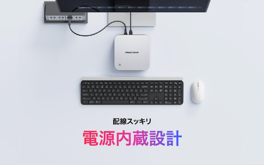 ミニPCのコンパクトな筐体に電源ユニットを内蔵し、かさばるACアダプタ無しでスマートな配線が可能です。