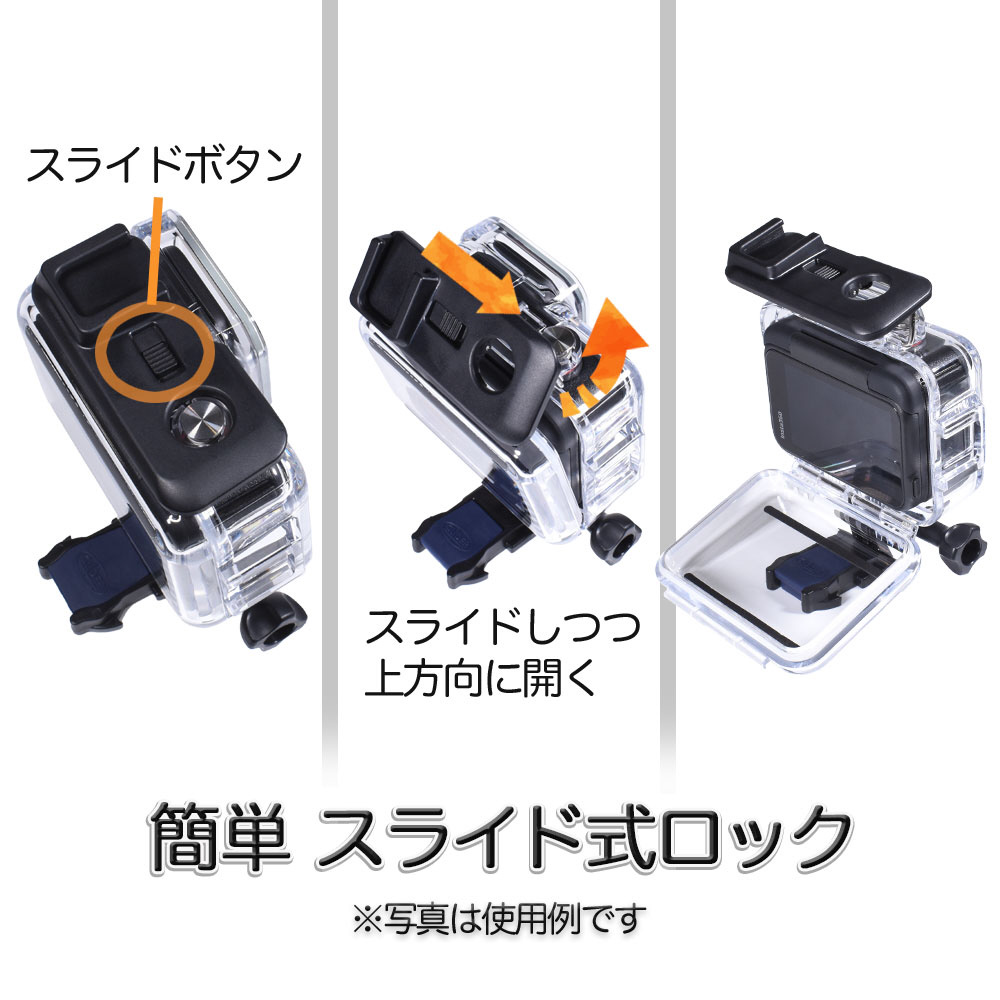 装着したまま電源・録画操作が可能です。外部からの衝撃保護にも有効です。(設定はハウジングに入れる前に行って下さい。)