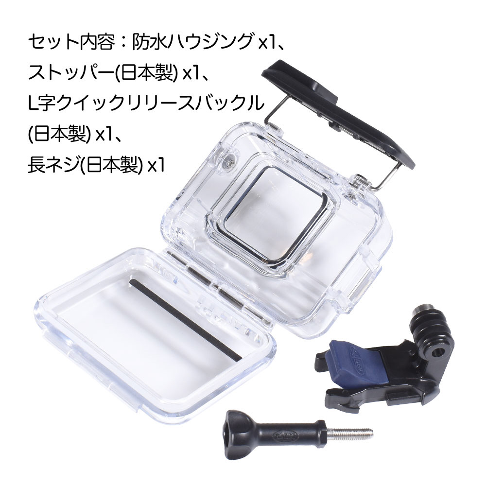 ●セット内容:防水ハウジング x 1、L字クイックリリースバックルx 1、ストッパーx 1、長ネジx 1