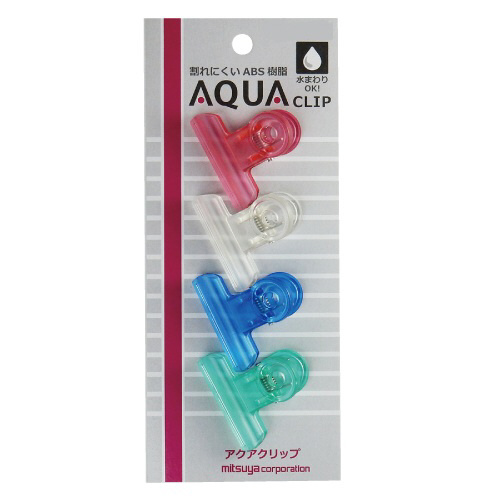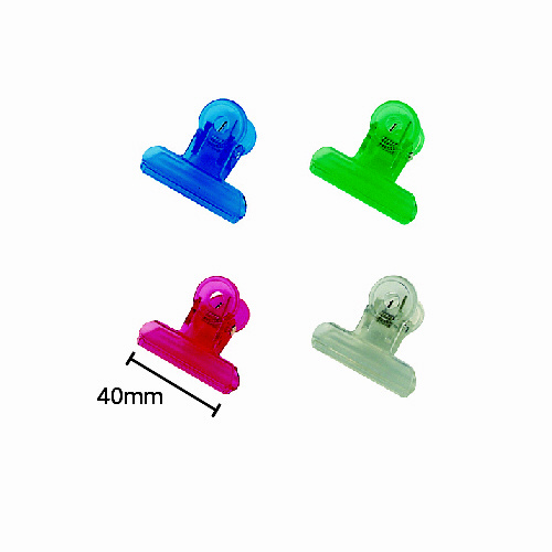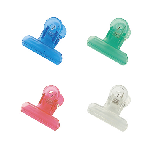 ●寸法:挟み口40mm●材質:ABS樹脂,ステンレスバネ●包装:フックの出きるスライドパック●入数:4本●色:スケルトン調レッド,ブルー,グリーン,クリア