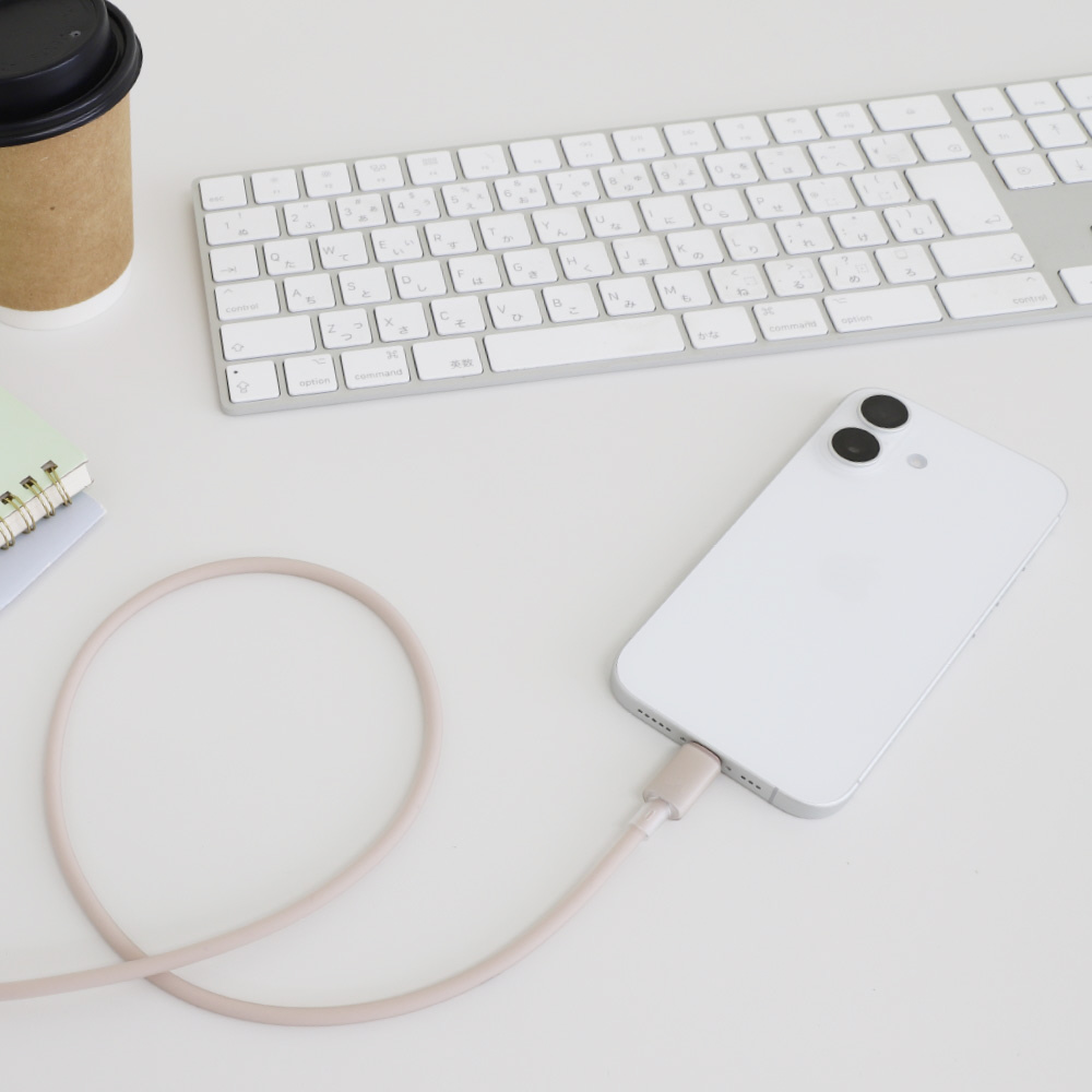 シリコンケーブルの絡まりにくさに、ホコリが付きにくいさらさらとした手触りが合わさることで、思わず触れてしまいたくなる素材が生まれました。