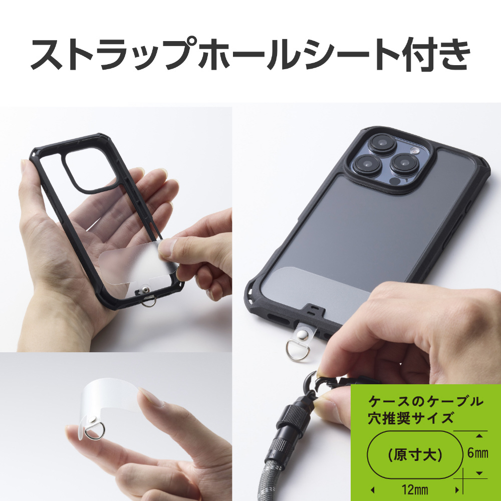 ケースにストラップホールがなくても、付属のストラップホールシートをスマートフォンとケースの間に挟むだけで使用できます。