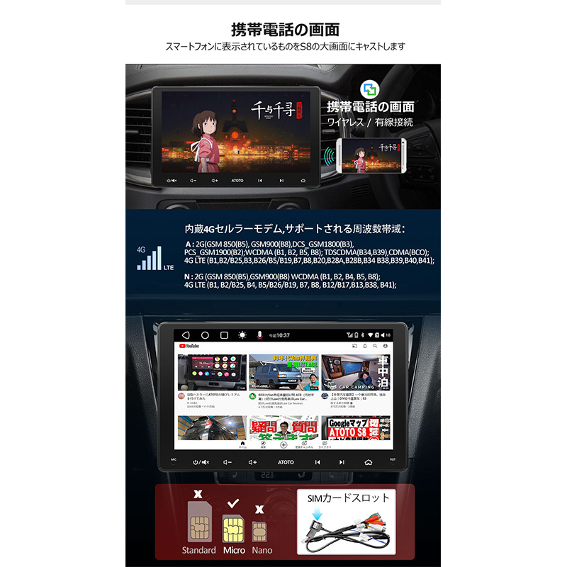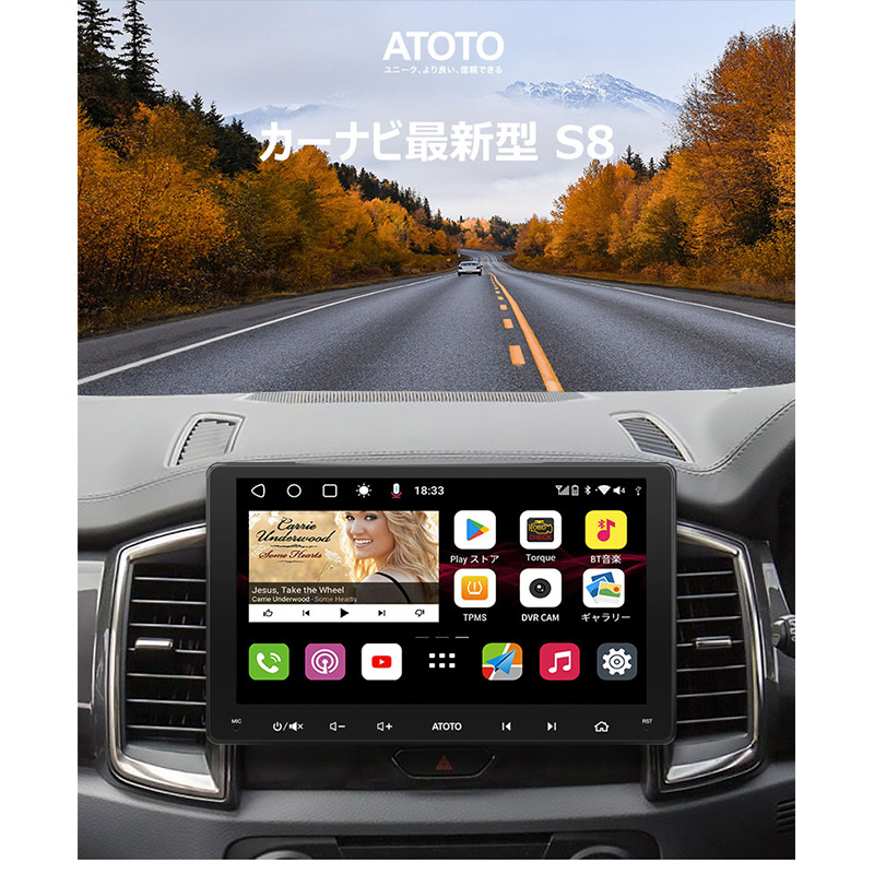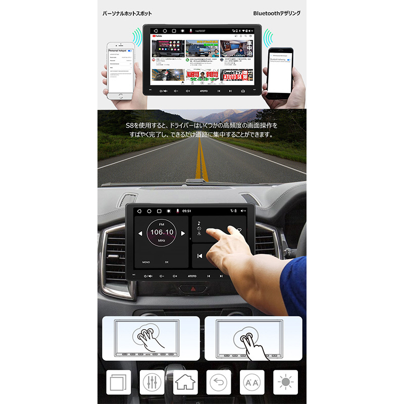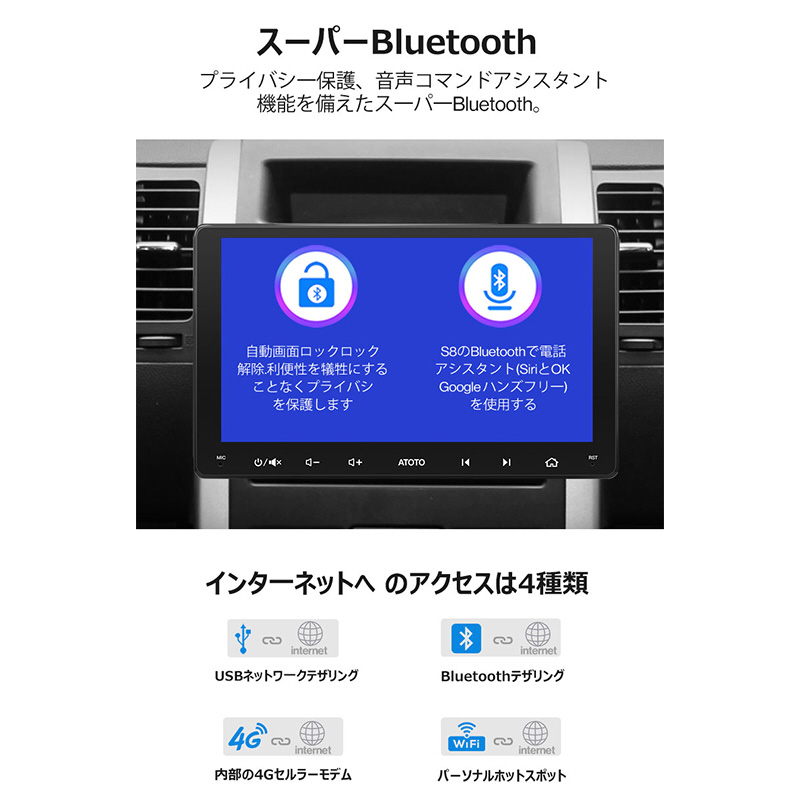 ATOTO S8 Gen3は、9インチ1280X720 HD QLEDの大きく広いタッチスクリーンを提供しますが、エアベント、ノブ、またはボタンを遮らない設計です。178°の全視野角で、多画面作業と運転の安全性を向上させます。ケーブルやUSBプラグなしでスムーズな操作が可能です。効率的な12nm SoCとARM Cortexオクタコアプロセッサーで高性能を実現。ATOTO AICE UI 11.0 on Android Qで深いカスタマイズができます。4G LTE、Wi-Fiホットスポット、Bluetooth、USBテザリングの4つのインターネット接続オプションを提供します。