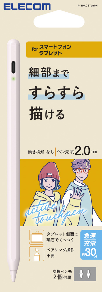 隙間時間の充電ですぐに使える!約30分でフル充電可能な急速充電機能を搭載した、汎用アクティブタッチペンです。約2.0mmのペン先で細かい作業、メモや絵を描くのにおすすめ。ペン先は導電性に優れたポリアセタール樹脂(POM)を採用し、滑らかな描き心地で画面を傷つけにくいです。