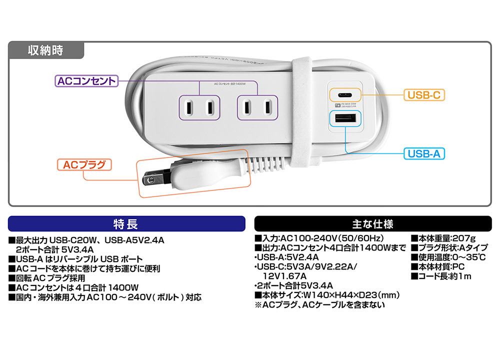 旅行用電源タップAC4 USBA+C PD20W 1m 自動識別 リバーシブル ホワイト WM-28