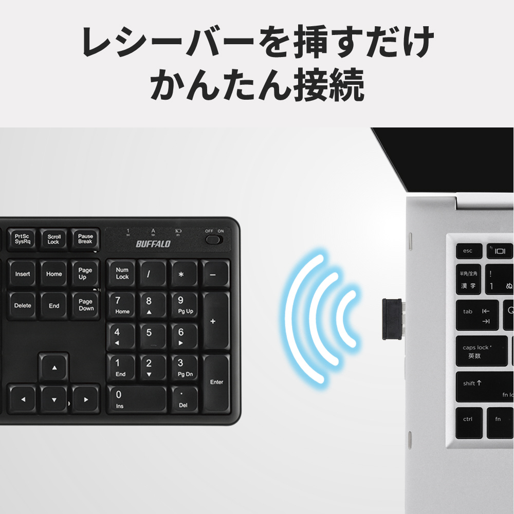 ※防音室で50cm離れた位置でのキー入力時の音量が、公益社団法人 全国家庭電気製品公正取引協会で定められた静音と定義される一般的な騒音レベル 35db未満を満たすことを確認(2024年10月、BUFFALO社調べ BUFFALO社テスト値につき保証値ではありません)
