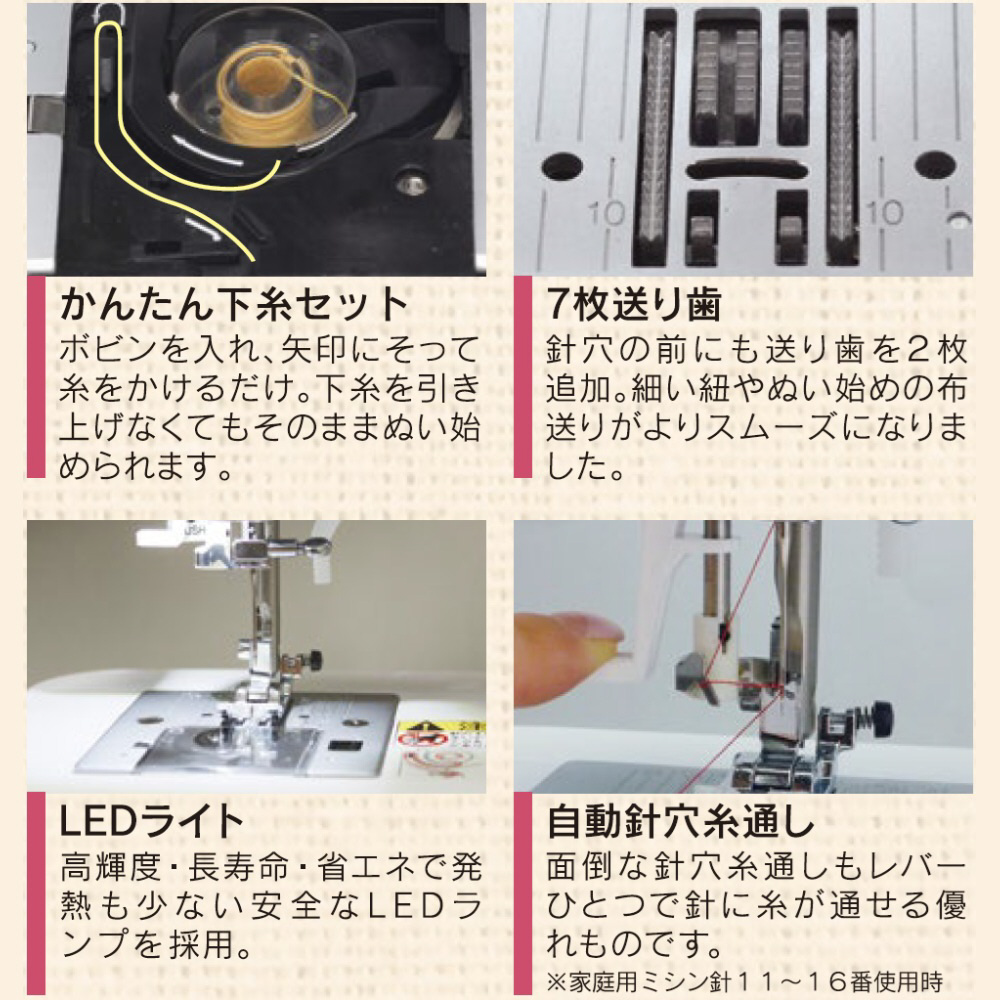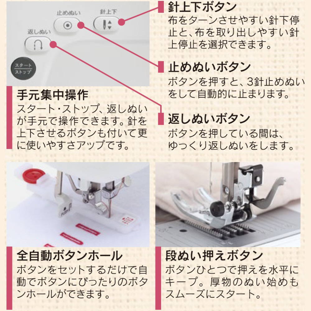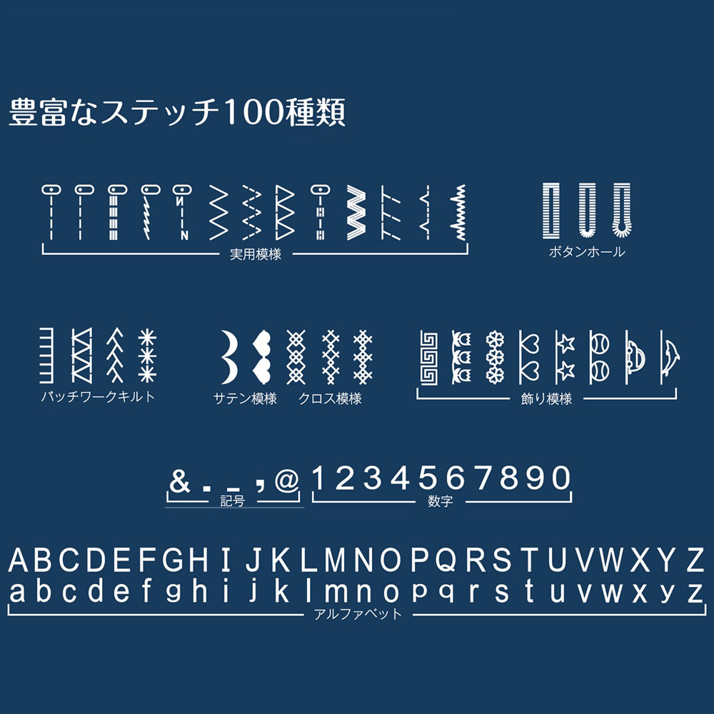 ジグザグ押え(本体に装着)・ファスナー押え・ボタンホール押え・ボタンつけ押え・縁かがり押え・ブラインドステッチ押え・サテン押え・ボビン・三角ドライバー・ドライバー(小)・ブラシ付きリッパー・針パック・シームガイド・糸コマ押え(大)・糸コマ押え(小)・補助糸立棒・糸コマ座・ソフトカバー・使用の手びき・使用説明DVD・電源コード