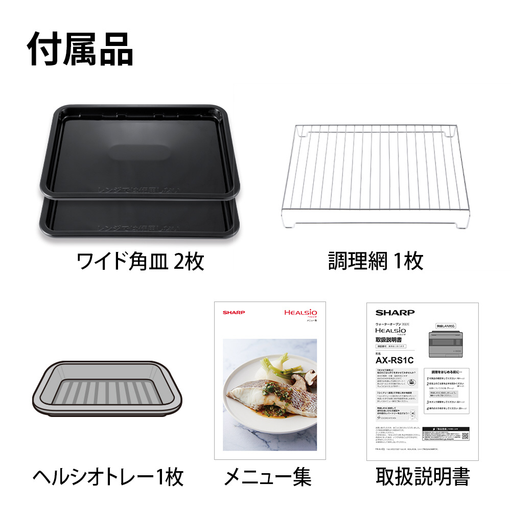 調理網1枚、ワイド角皿2枚、ヘルシオトレー1枚、メニュー集、取扱説明書(保証書付)