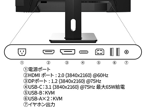 ■インターフェイスはHDMI2.0 x1 (60Hz)、DisplayPort1.2 x1 (75Hz)とUSB Type-C x1 (75Hz/最大65W給電)を装備し、様々な機器との接続が可能です。USB-C(最大65W給電)は、対応のPCであればUSB-Cケーブル1本でモニターへの映像出力とノートPCへの給電が可能。ケーブル1本でスッキリ接続出来るだけでなく、テレワーク、出社併用の場合などノートPCのACアダプターを持ち運ぶ必要が無くなります。