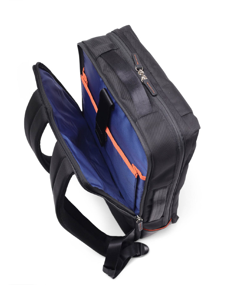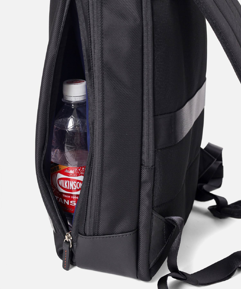本体構造は2ルーム+前ポケット仕様で、背面ルームはクッション材入りのPC対応です。13〜14インチのパソコンが収納できます。メインルームには、ガジェット付属品などの小物も収納しやすいゴムポケットを装備。ペットボトルや小物が収納できる前ファスナーポケットなど、分類収納にも優れています。