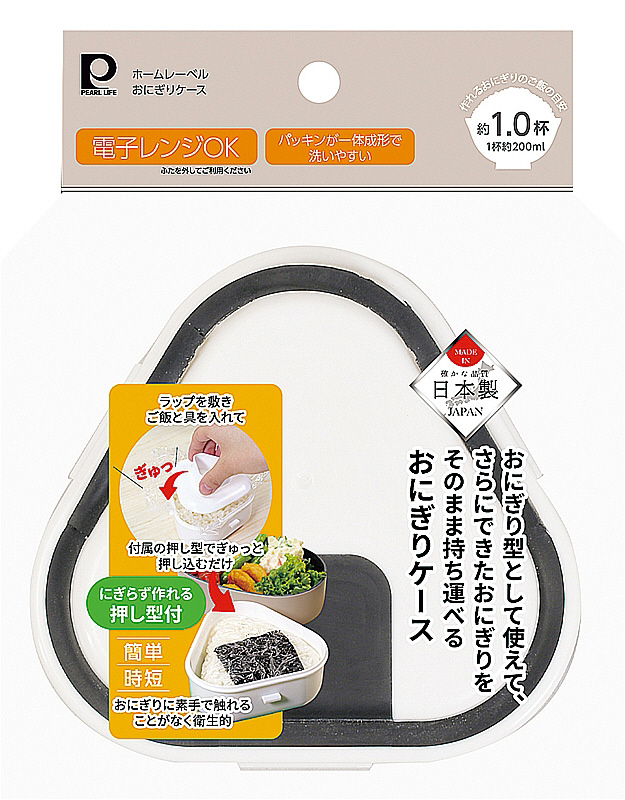 おにぎりが簡単に作れるおにぎりケース。おにぎり型として使えて、さらにできたおにぎりをそのまま持ち運べるおにぎりケース。付属の押し型で押し込むだけでおにぎりが作れます。電子レンジ使用可能。ふたを外してご利用ください。おにぎりを素手で触れることがなく衛生的