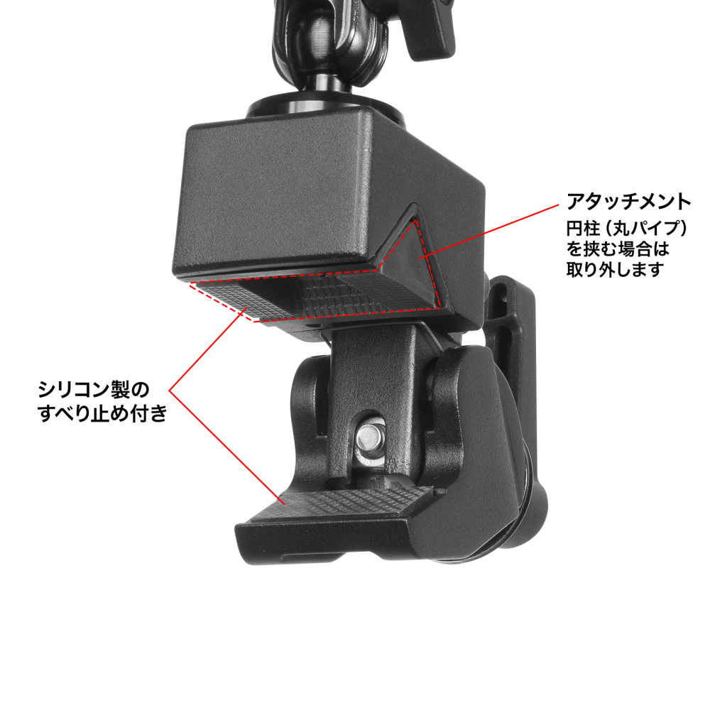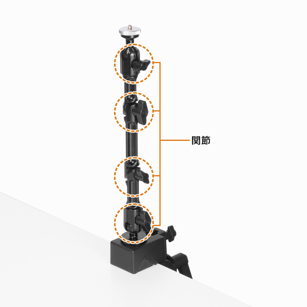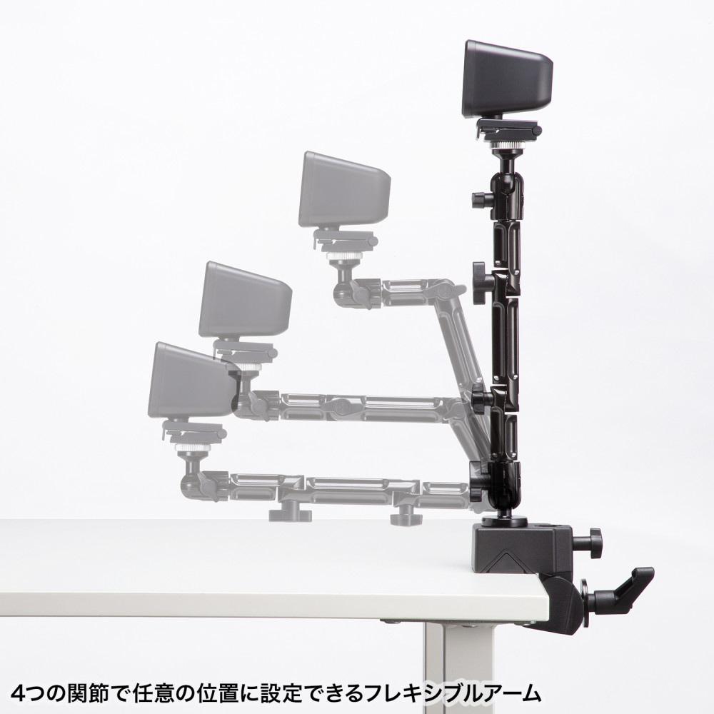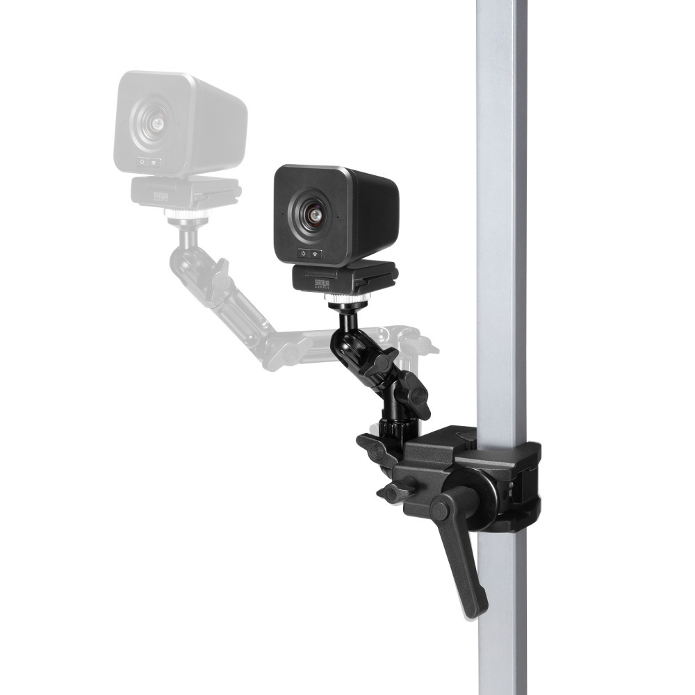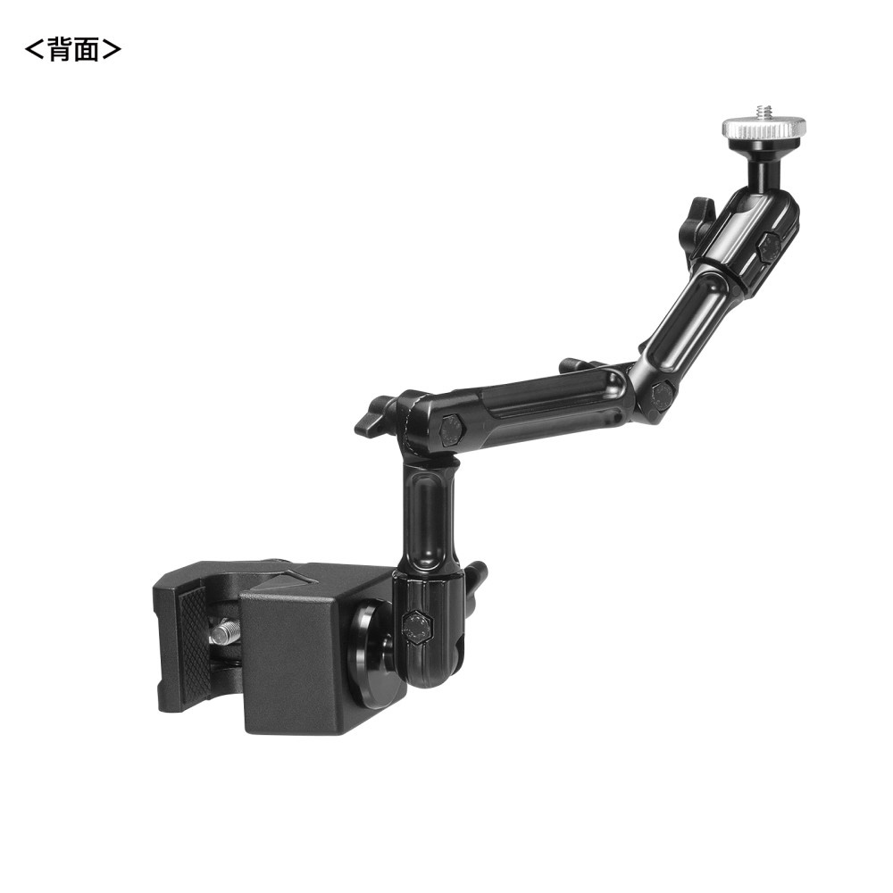 4つの関節を調整して、カメラを任意の位置に固定できるクランプ式アーム。丸・角パイプに取り付け可能。