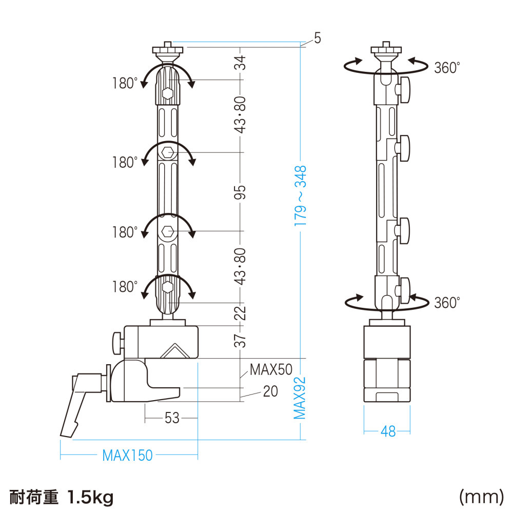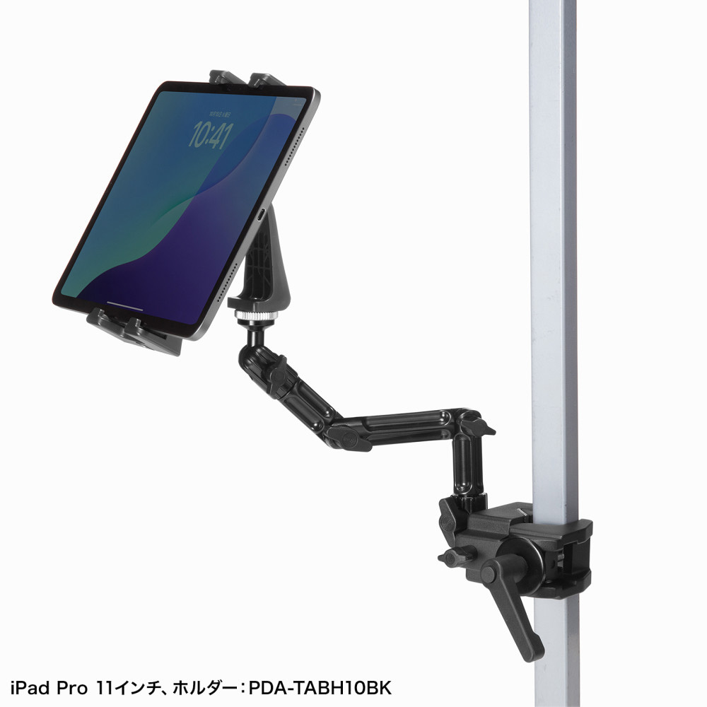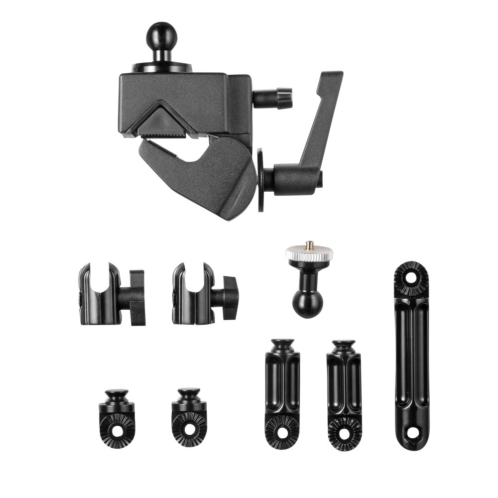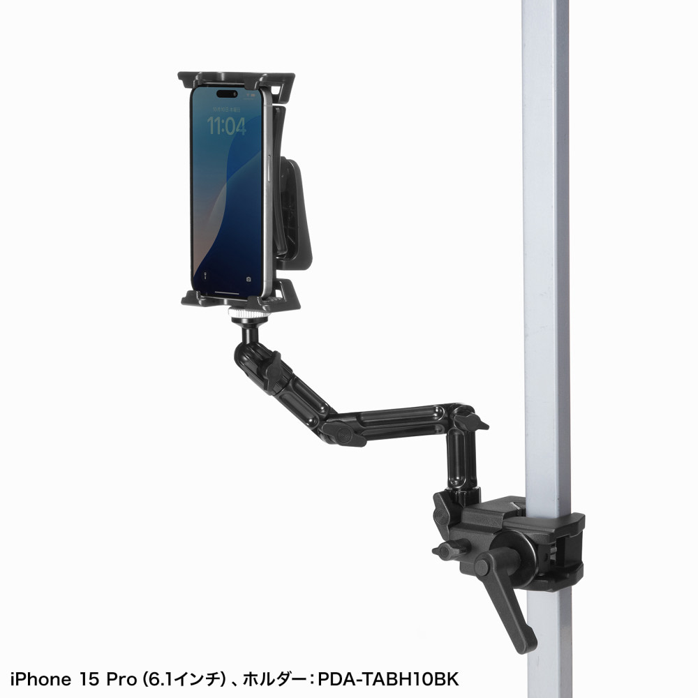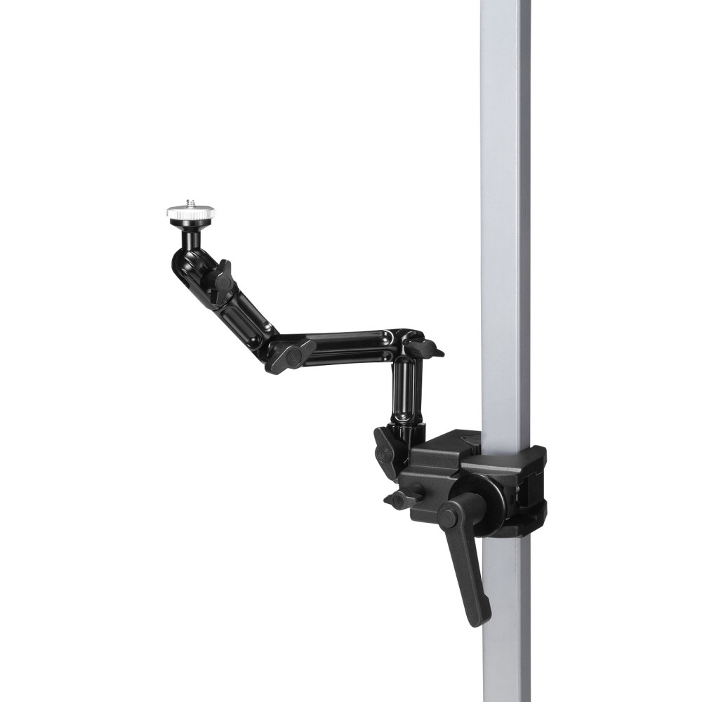 4つの関節を調整して、カメラを任意の位置に固定できるクランプ式アーム。丸・角パイプに取り付け可能。