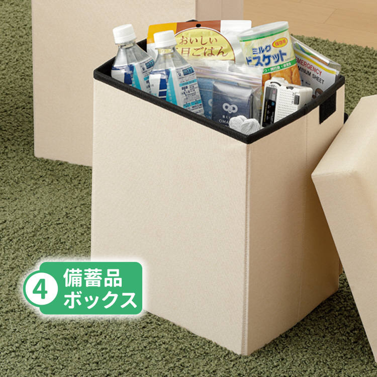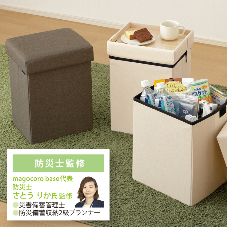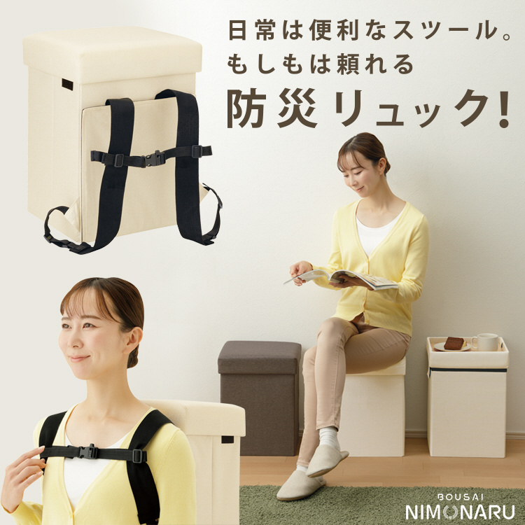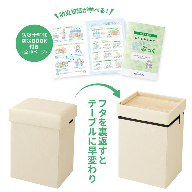普段はスツール、テーブル、オットマン、備蓄品ボックスとして活躍し、万が一の際は防災リュックとして持ち出せます。インテリアにも馴染むデザインで、リビングや寝室など様々な場所で活用可能。耐荷重100kgの座面はふかふかで快適、避難先でもテーブルやスツールとして使用でき、安心をサポートします。 さらに、防災士監修の「防災BOOK」付きで、備えも万全です。