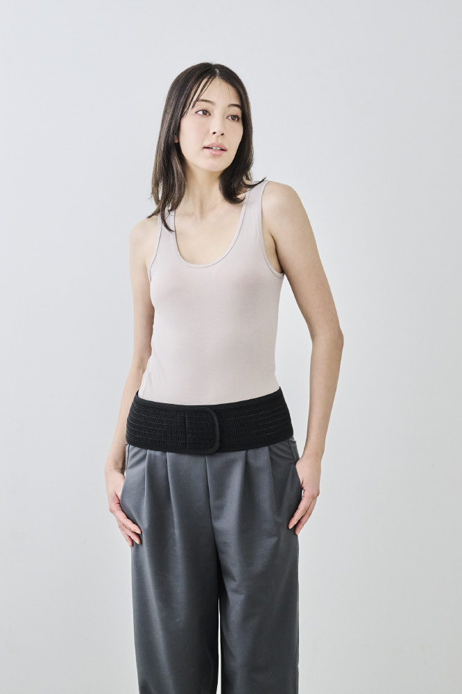 好きなところに留められる面ファスナーを採用。締め付け具合を調整しやすく幅広いウエストサイズに対応可能です。