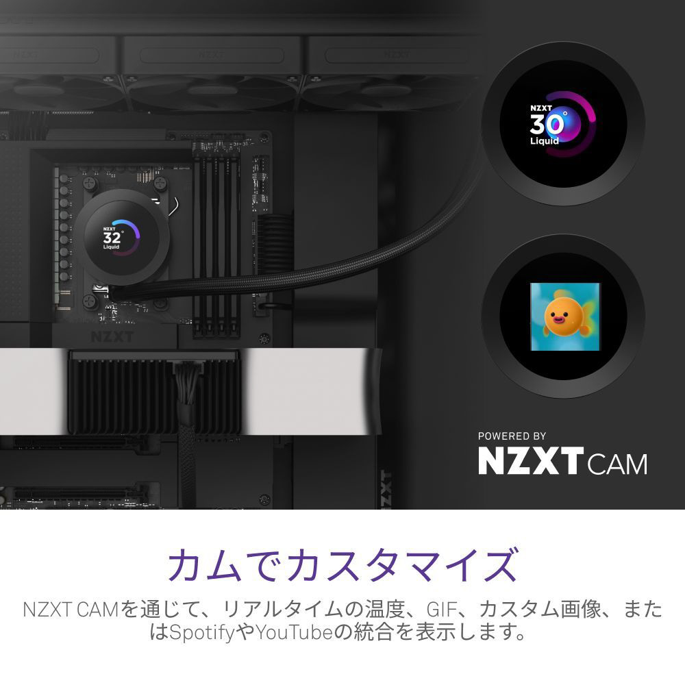 明るい1.54インチの正方形LCDにリアルタイムのシステム温度、アニメーションGIF、カスタム画像、またはSpotifyやYouTubeのようなウェブ統合を表示できます。NZXT CAMソフトウェアを通じて完全にカスタマイズ可能です。