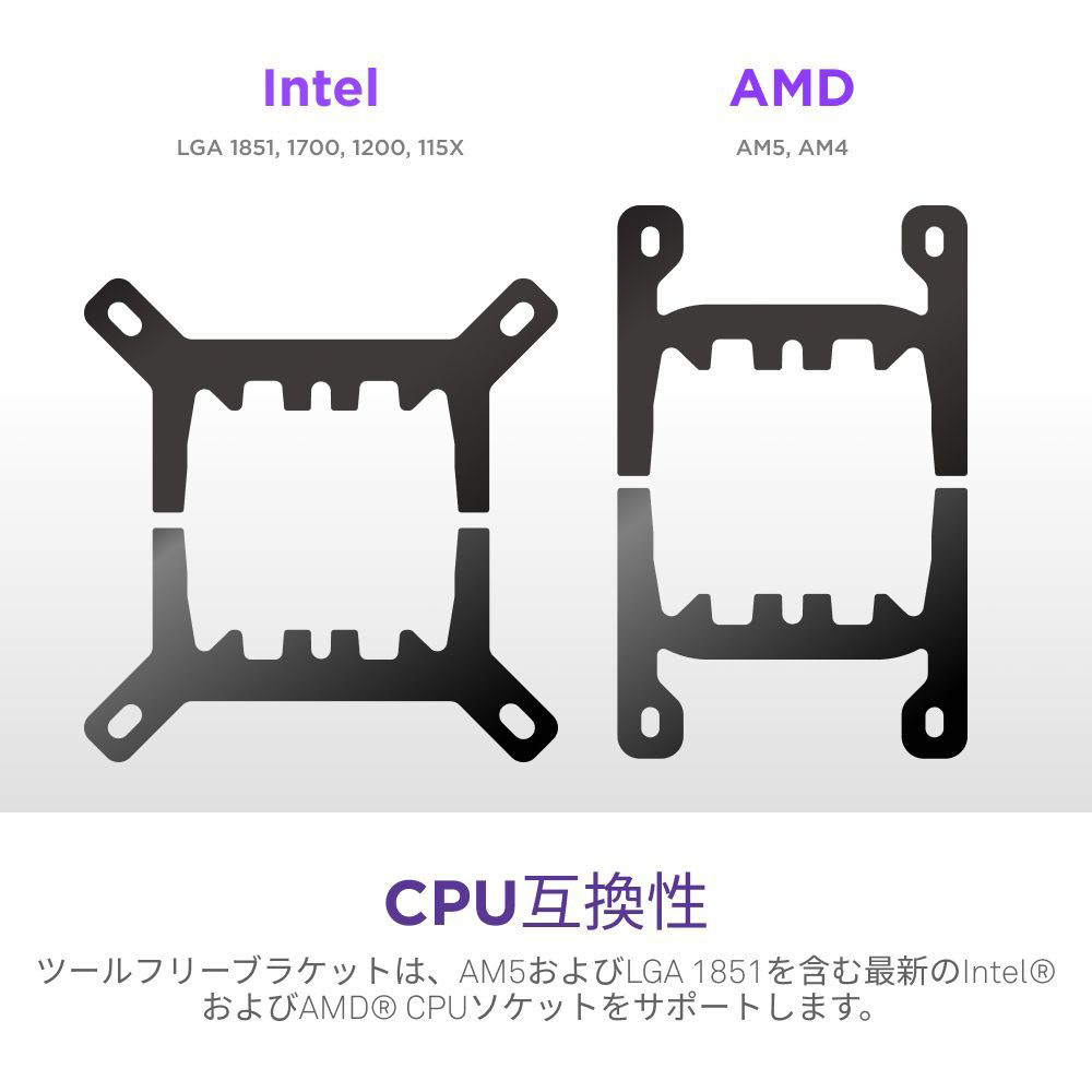 最新のAMDRおよびIntel CPUソケット(AM5およびLGA 1851を含む)をサポートするツール不要のマウンティングブラケットが含まれています。