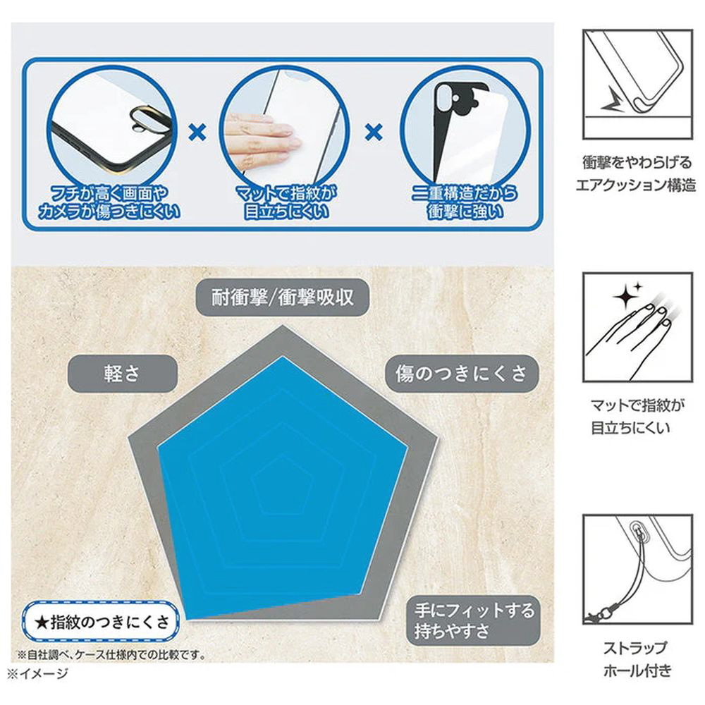 フチが高く画面やカメラが傷つきにくい。指紋が目立ちにくく質感の良いデザイン。衝撃に強い2重構造。