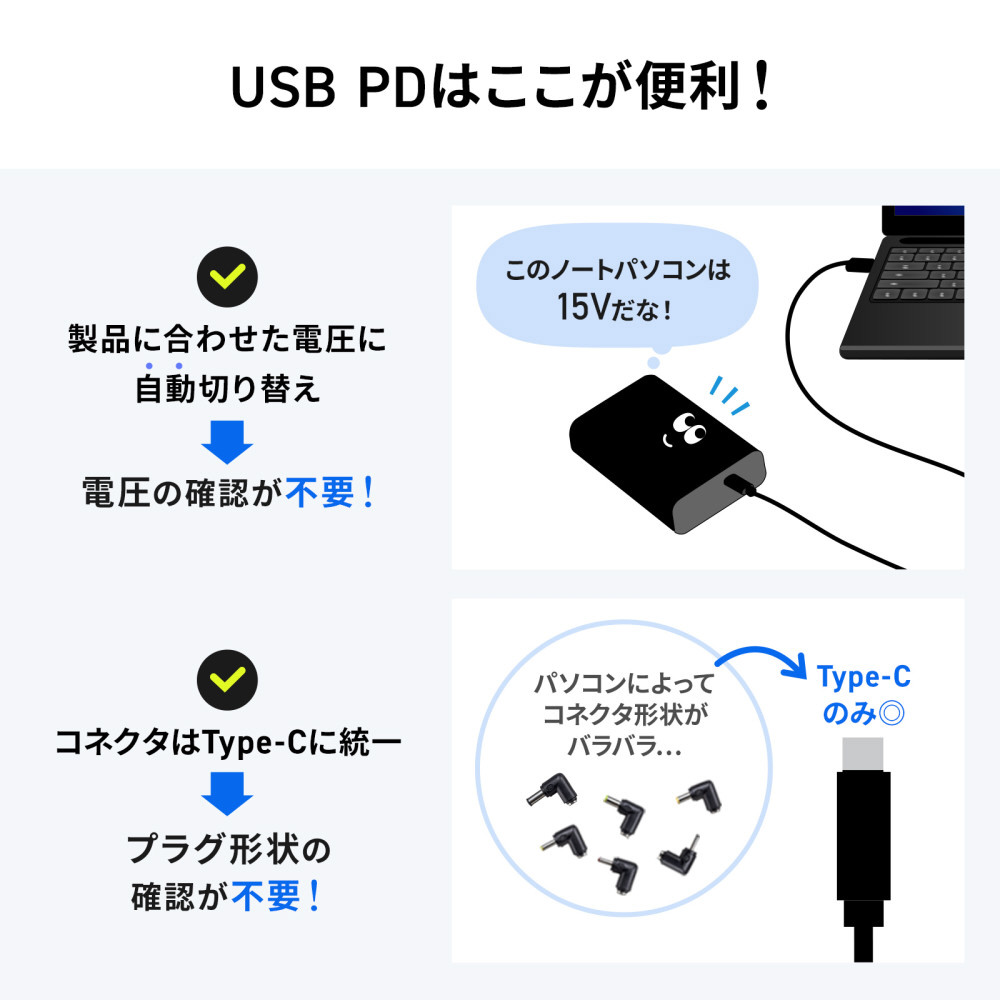●USB PD規格による充電は機器を接続するだけで接続機器の仕様に合わせて出力電圧を自動で切替える為、機器に合わせた最適な出力で充電します。