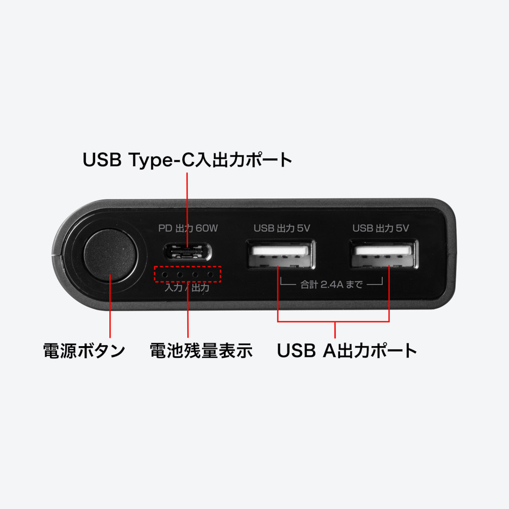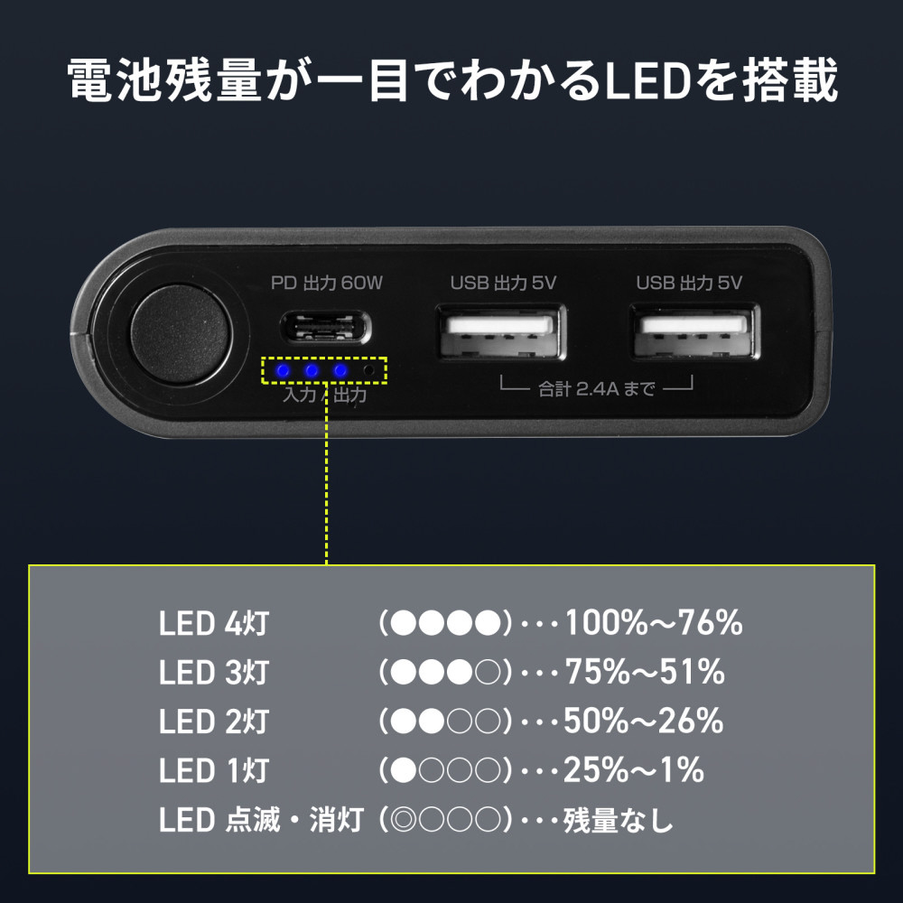 Type-Cポート搭載のノートパソコンやタブレットに充電ができるUSB Power Delivery規格60W出力に対応したモバイルバッテリー。