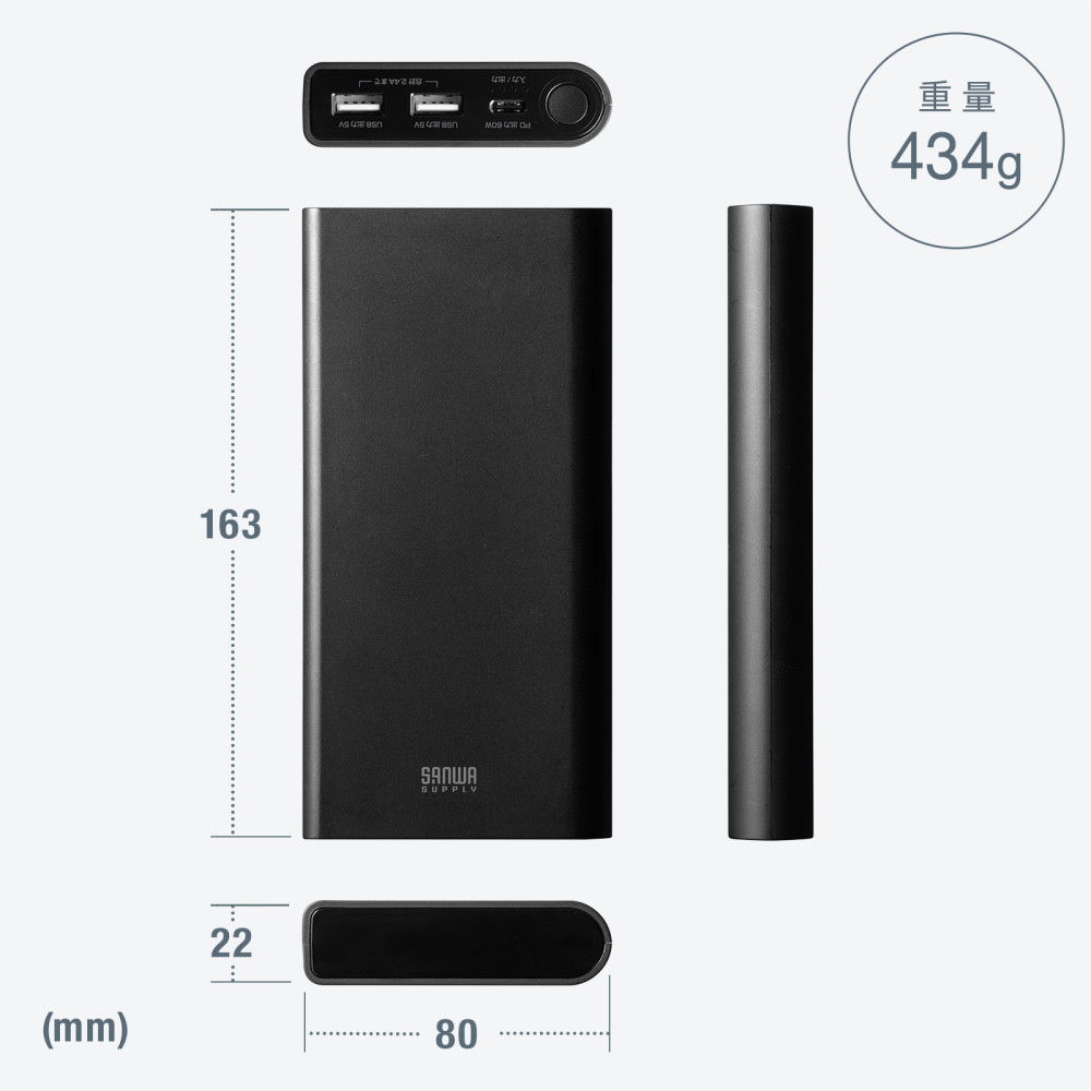 ●USB Power Delivery(USB PD)規格による最大60Wの出力に対応し、USB Type-Cポート搭載のノートパソコンへ充電ができる容量19800mAh(並列換算値)のモバイルバッテリーです。
