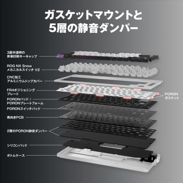 1層のシリコン素材と4層のPORON が振動を吸収し、スイッチのクリック音やエコーを最小限に抑えることで、心地よい打鍵音を実現