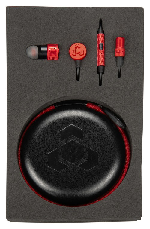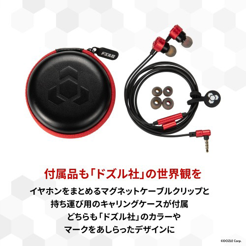 気軽に持ち運びができるように、セミハードのオリジナルキャリングケースと、長いケーブルも整理可能なマグネットケーブルクリップをご用意しました。イヤホンを保護しながら気軽に持ち歩くことができるキャリングケースには、ドズル社のマークをエンボス加工で表現。ファスナーのテープカラーはドズレッド、開閉する引手にはドズル社のロゴタイプをあしらいました。イヤホンのコードを簡単にまとめることができるマグネットケーブルクリップも、ドズル社のマークをあしらったコラボならではのデザインです。