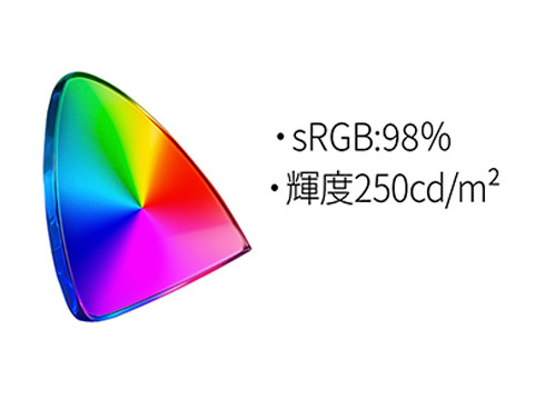 ■上下左右178度に対応した広視野角IPSパネルを搭載し、コンテンツを色鮮やかに映し出します。最大輝度250cd/m2の液晶パネルは、sRGB:98%の広色域に対応し、動画や写真も色鮮やかに美しく表示します。