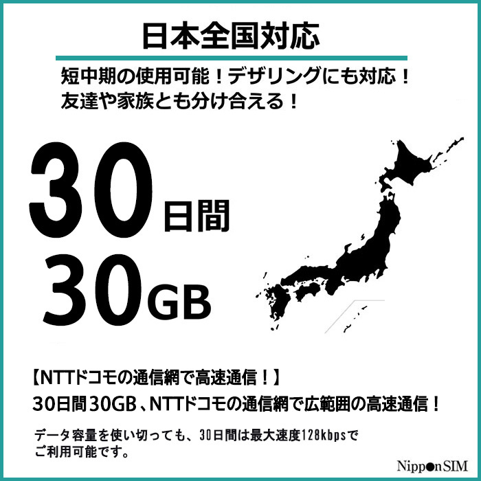 Nippon SIM for Japan 30日30GB 日本国内用 ドコモ回線 プリペイドデータSIMカード