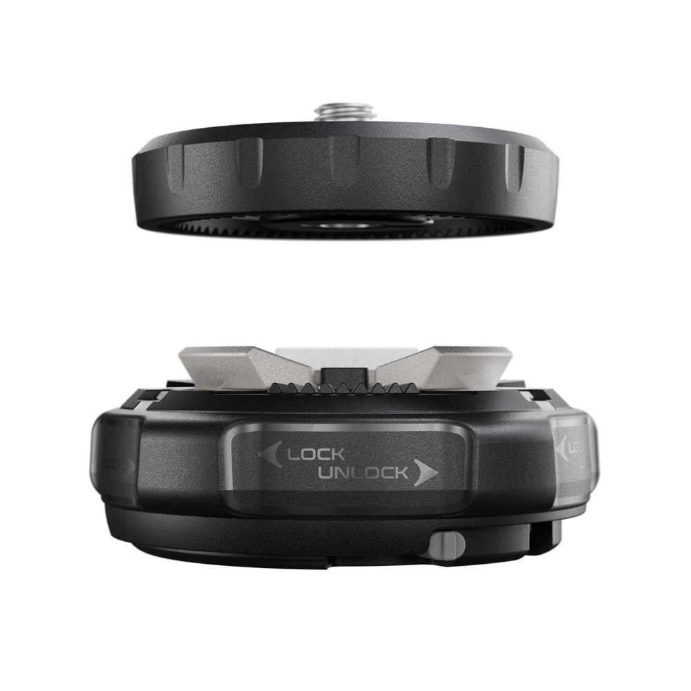 Xchangeクイックリリースシステムは、XchangeベースとXchangeプレートの二つのパーツで構成されており、それぞれ個別に購入することもできます。土台となるベースに、プレートを上から押し込むだけで装着、ベースのリングを捻れば一瞬でプレートを外すことができます。雲台やスライダーなどを瞬時に交換できるため、撮影シーンに合わせたセッティング変更がこれまで以上に簡単になります。ベースのリングにはセーフティロックが備わっているため偶発的な脱着事故を防ぐことができます。
