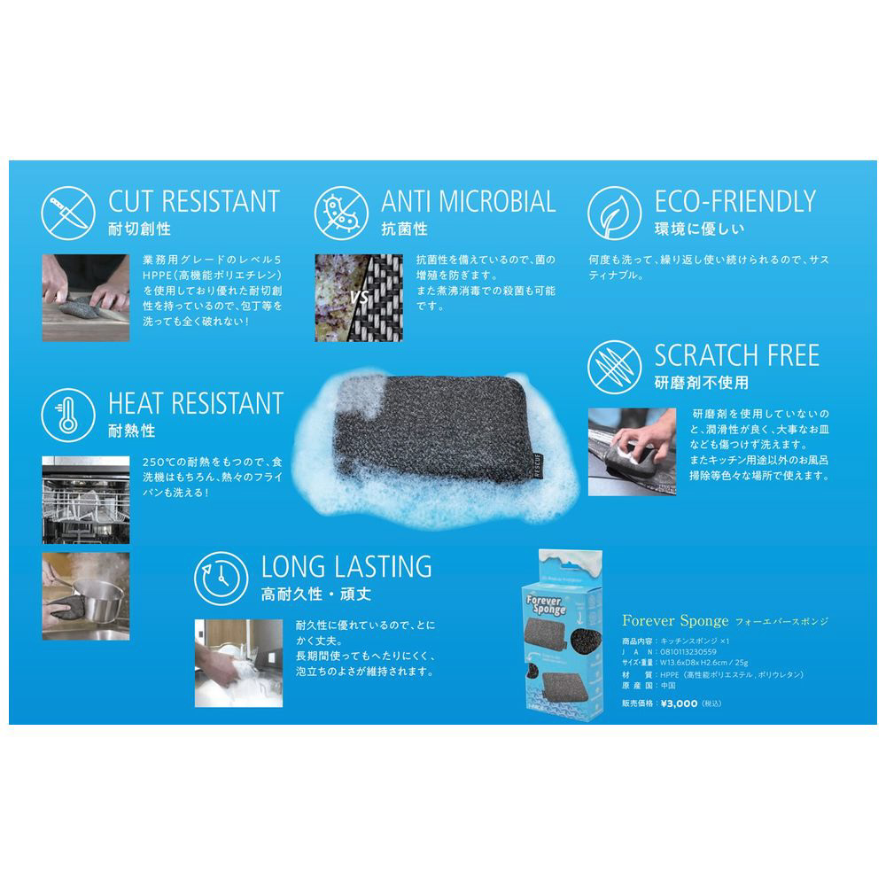ナイフでも破れない 、熱にも強い 、抗菌性を持つ 、タフでクリーンな長年使えるスポンジ!
