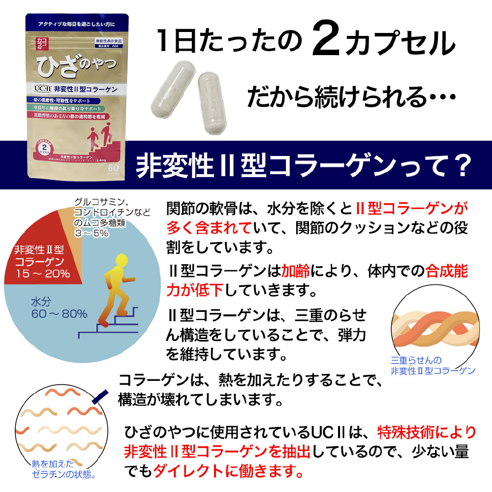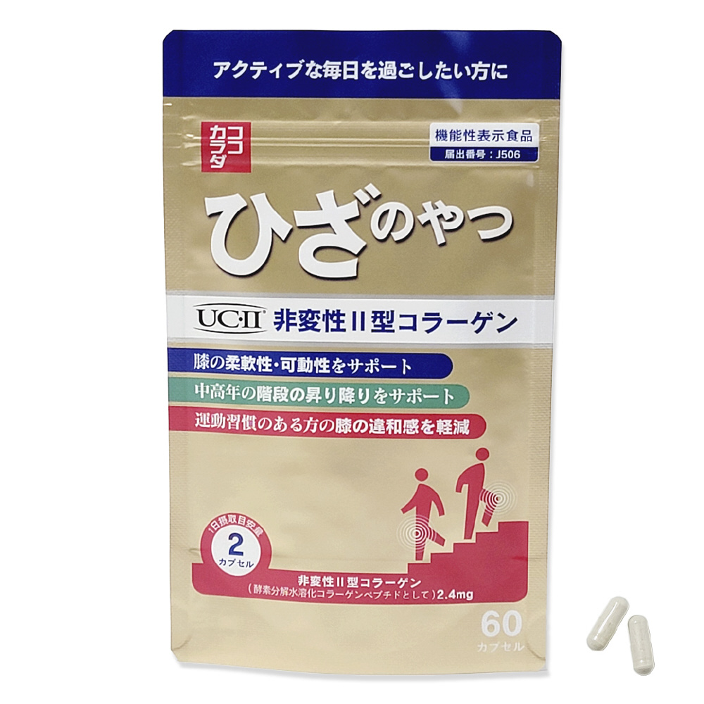 「ココカラダ ひざのやつ 非変性2型コラーゲン」は、ひざ関節が気になる方の機能性表示食品(届出表示番号 J506)です。